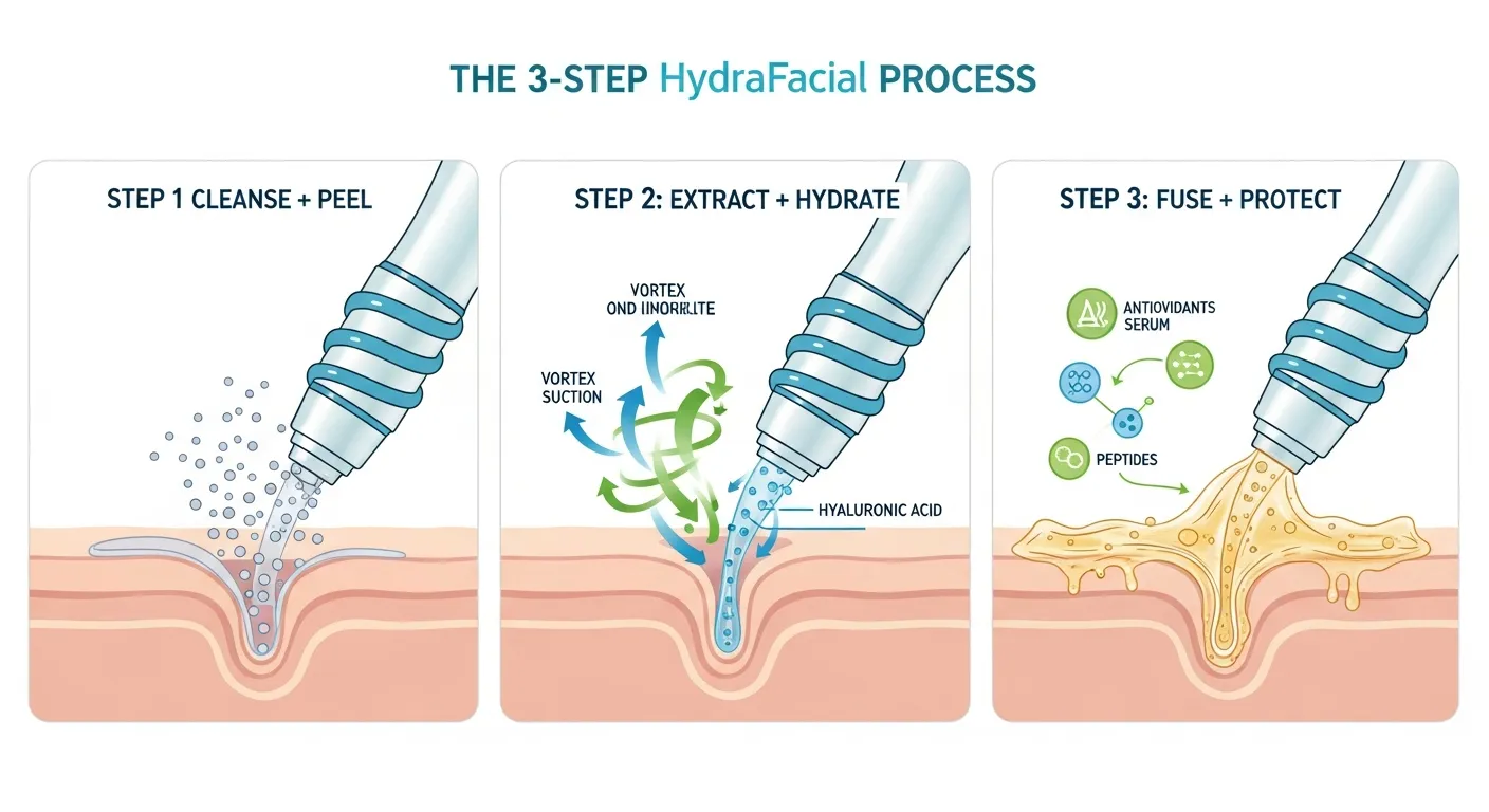HydraFacial is a facial treatment that combines cleansing, gentle exfoliation, and suction based extraction with targeted serum infusion. The device uses a spiral tip and a vortex style delivery system to help lift away surface buildup and pore debris while delivering hydrating ingredients.